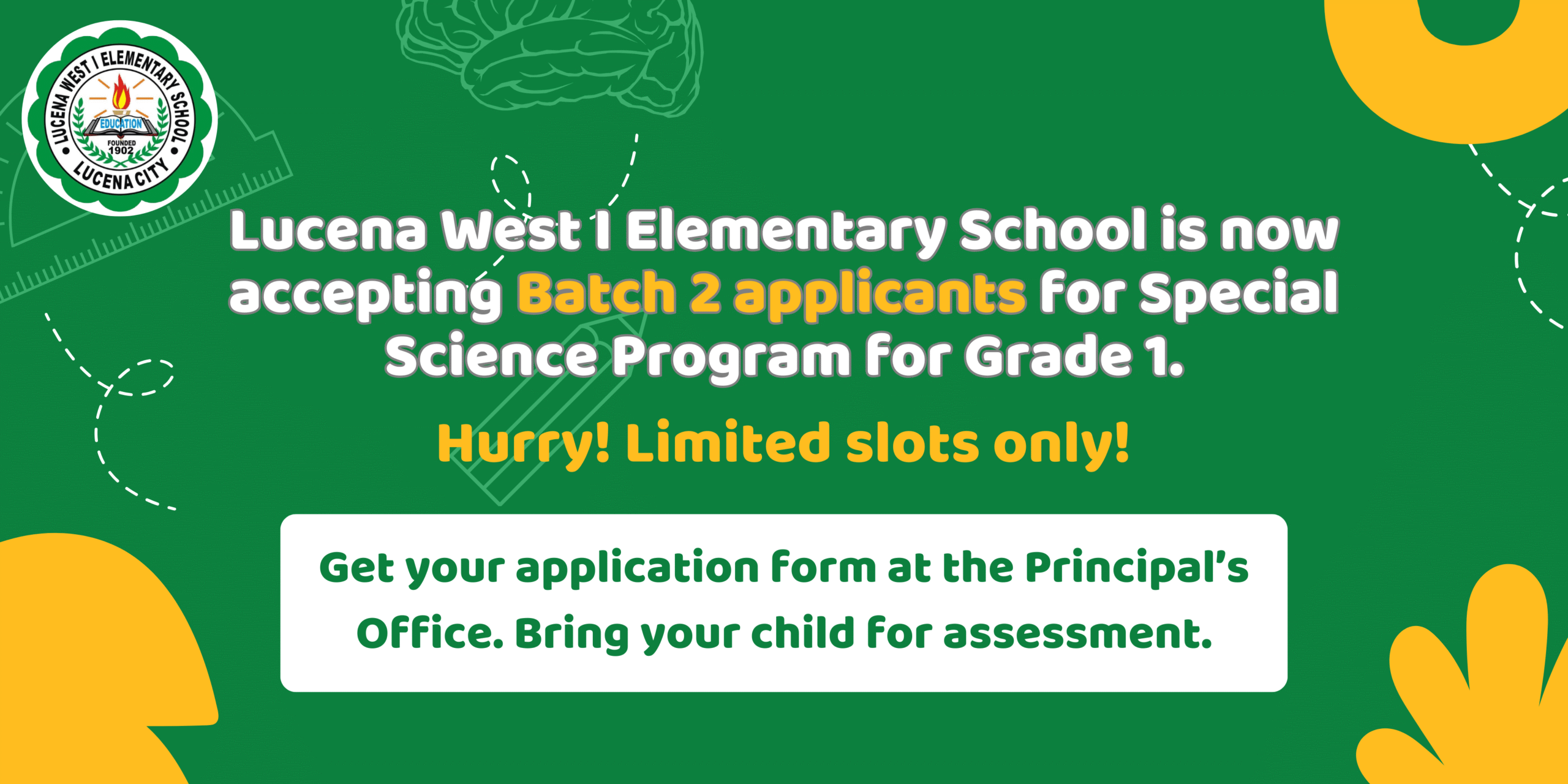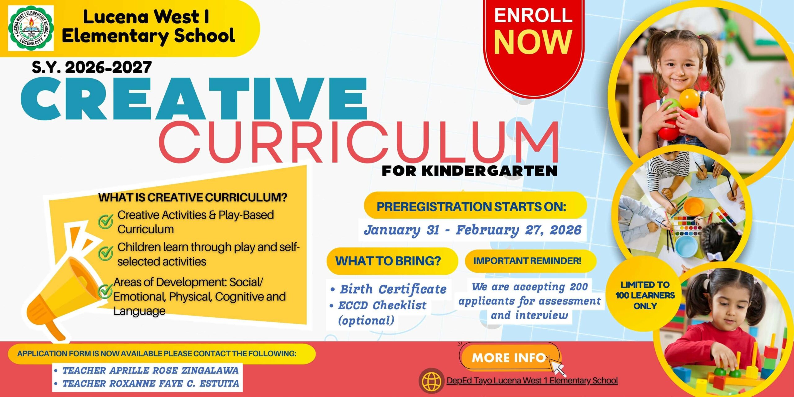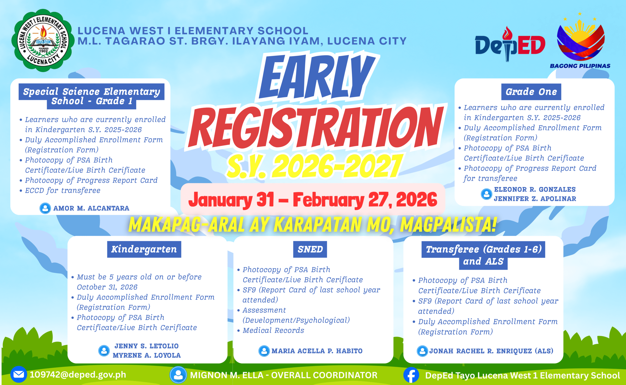 Lucena West 1 Elementary School successfully conducted its Early Registration for incoming Kindergarten, Grade 1, Alternative Learning System (ALS), and Special Needs Education (SNED) learners for School Year 2026โ2027 on January 31, 2026, at 7:00 a.m. The program formally began with an opening prayer, followed by the singing of the Philippine National Anthem. This was continue reading : ๐๐๐ซ๐ฅ๐ฒ ๐๐๐ ๐ข๐ฌ๐ญ๐ซ๐๐ญ๐ข๐จ๐ง ๐๐จ๐ซ ๐๐ ๐๐๐๐โ๐๐๐๐ ๐๐ข๐๐ค ๐จ๐๐ ๐๐ญ ๐๐ฎ๐๐๐ง๐ ๐๐๐ฌ๐ญ ๐ ๐๐ฅ๐๐ฆ๐๐ง๐ญ๐๐ซ๐ฒ ๐๐๐ก๐จ๐จ๐ฅ