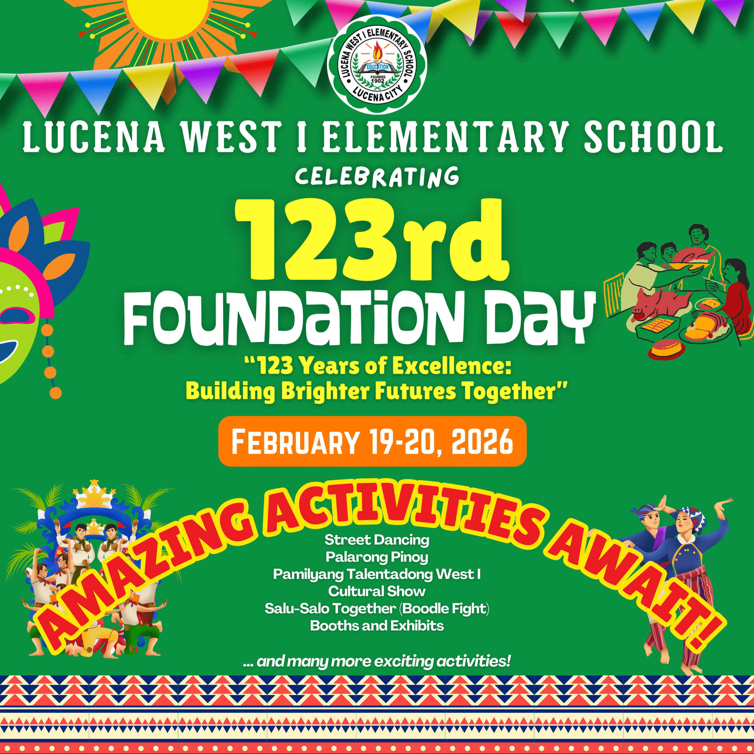 With the theme โ123 Years of Excellence: Building Brighter Futures Together,โ enjoy exciting activities such as Street Dancing, Palarong Pinoy, Cultural Show, Family Talentadong West I, Salu-Salo (Boodle Fight), booths, and exhibits, and more. Come and celebrate with us as we honor 123 years of excellence and unity!